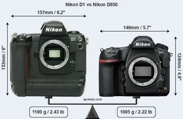 An illustration of the physical size and weight of the Nikon D1 and the Nikon D850 is provided in the side-by-side display below. The two cameras are presented according to their relative size. Three successive views from the front, the top, and the rear are shown. All width, height and depth dimensions are rounded to the nearest millimeter.