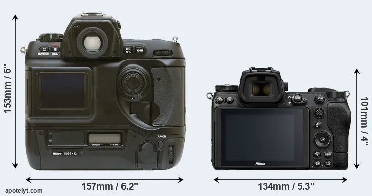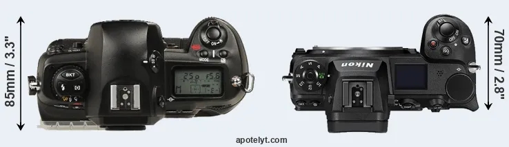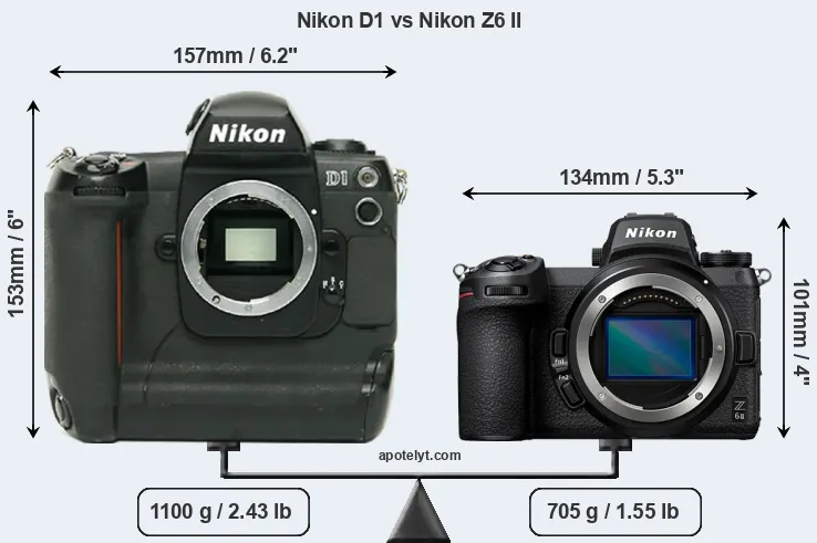 The side-by-side display below illustrates the physical size and weight of the Nikon D1 and the Nikon Z6 II. The two cameras are presented according to their relative size. Three consecutive perspectives from the front, the top, and the back are available. All width, height and depth measures are rounded to the nearest millimeter.
