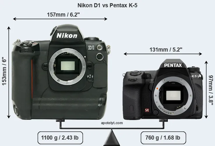 The physical size and weight of the Nikon D1 and the Pentax K-5 are illustrated in the side-by-side display below. The two cameras are presented according to their relative size. Three consecutive views from the front, the top, and the rear side are shown. All width, height and depth dimensions are rounded to the nearest millimeter.