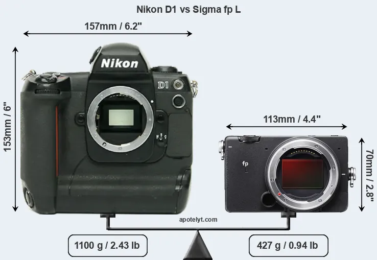 An illustration of the physical size and weight of the Nikon D1 and the Sigma fp L is provided in the side-by-side display below. The two cameras are presented according to their relative size. Three successive views from the front, the top, and the rear are shown. All width, height and depth measures are rounded to the nearest millimeter.