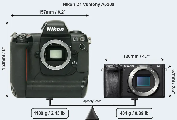 If the front view area (width x height) of the cameras is taken as an aggregate measure of their size, the Sony A6300 is considerably smaller (67 percent) than the Nikon D1. Moreover, the A6300 is substantially lighter (63 percent) than the D1. In this context, it is worth noting that both cameras are splash and dust-proof and can, hence, be used in inclement weather conditions or harsh environments.
