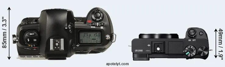 An illustration of the physical size and weight of the Nikon D1 and the Sony A6300 is provided in the side-by-side display below. The two cameras are presented according to their relative size. Three successive views from the front, the top, and the rear are shown. All width, height and depth measures are rounded to the nearest millimeter.