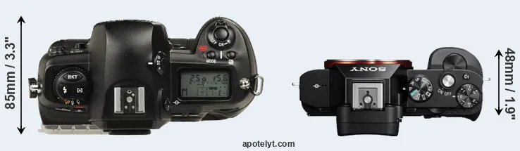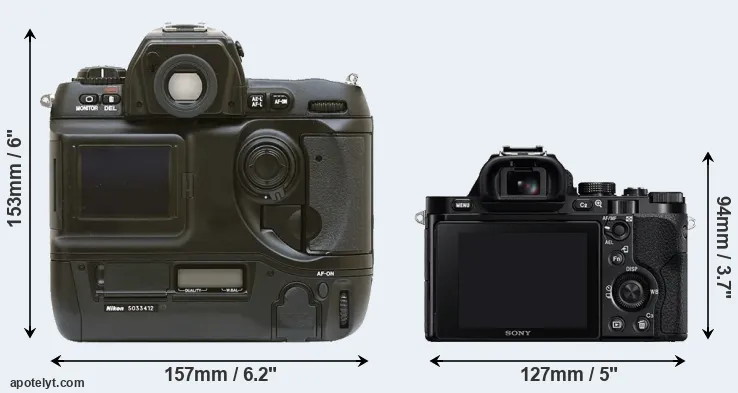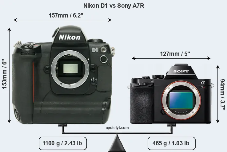 The physical size and weight of the Nikon D1 and the Sony A7R are illustrated in the side-by-side display below. The two cameras are presented according to their relative size. Three consecutive perspectives from the front, the top, and the back are available. All width, height and depth dimensions are rounded to the nearest millimeter.