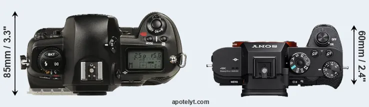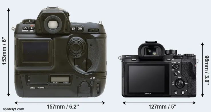 The side-by-side display below illustrates the physical size and weight of the Nikon D1 and the Sony A7S II. The two cameras are presented according to their relative size. Three successive views from the front, the top, and the rear are shown. All size dimensions are rounded to the nearest millimeter.