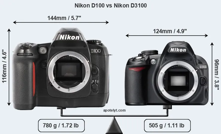 The physical size and weight of the Nikon D100 and the Nikon D3100 are illustrated in the side-by-side display below. The two cameras are presented according to their relative size. Three consecutive views from the front, the top, and the rear side are shown. All width, height and depth measures are rounded to the nearest millimeter.
