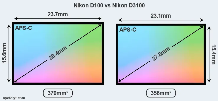 Both cameras under consideration feature an APS-C sensor, but their sensors differ slightly in size. The sensor area in the D3100 is 4 percent smaller. They nevertheless have the same format factor of 1.5. Both cameras have a native aspect ratio (sensor width to sensor height) of 3:2.