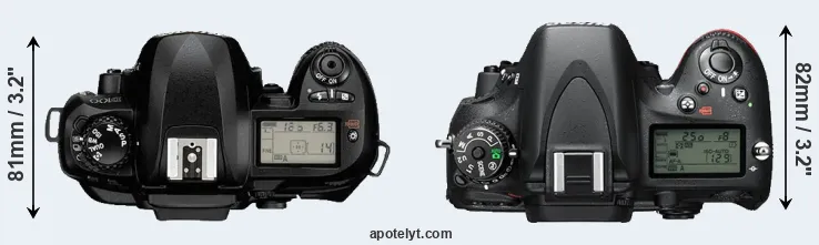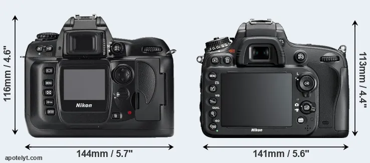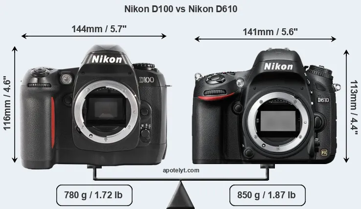 The side-by-side display below illustrates the physical size and weight of the Nikon D100 and the Nikon D610. The two cameras are presented according to their relative size. Three consecutive perspectives from the front, the top, and the back are available. All width, height and depth measures are rounded to the nearest millimeter.