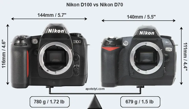 An illustration of the physical size and weight of the Nikon D100 and the Nikon D70 is provided in the side-by-side display below. The two cameras are presented according to their relative size. Three successive views from the front, the top, and the rear are shown. All width, height and depth dimensions are rounded to the nearest millimeter.