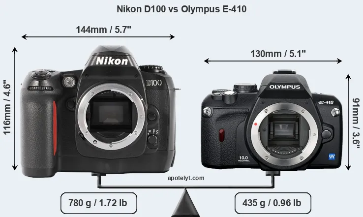 If the front view area (width x height) of the cameras is taken as an aggregate measure of their size, the Olympus E-410 is notably smaller (29 percent) than the Nikon D100. Moreover, the E-410 is substantially lighter (44 percent) than the D100. In this context, it is worth noting that neither the D100 nor the E-410 are weather-sealed.