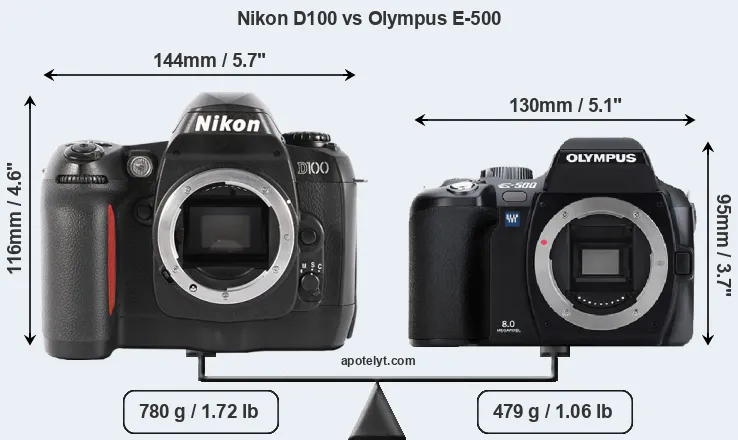 If the front view area (width x height) of the cameras is taken as an aggregate measure of their size, the Olympus E-500 is notably smaller (26 percent) than the Nikon D100. Moreover, the E-500 is substantially lighter (39 percent) than the D100. In this context, it is worth noting that neither the D100 nor the E-500 are weather-sealed.