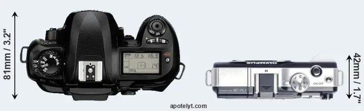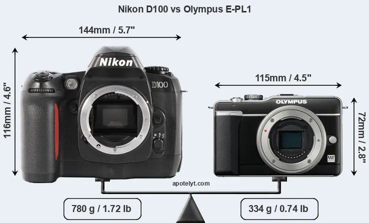 The side-by-side display below illustrates the physical size and weight of the Nikon D100 and the Olympus E-PL1. The two cameras are presented according to their relative size. Three consecutive perspectives from the front, the top, and the back are available. All size dimensions are rounded to the nearest millimeter.