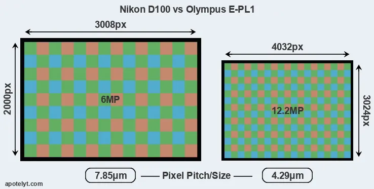Despite having a smaller sensor, the E-PL1 offers a higher resolution of 12.2 megapixels, compared with 6 MP of the D100. This megapixels advantage comes at the cost of a higher pixel density and a smaller size of the individual pixel (with a pixel pitch of 4.29μm versus 7.85μm for the D100). However, it should be noted that the E-PL1 is much more recent (by 7 years and 11 months) than the D100, and its sensor will have benefitted from technological advances during this time that make it possible to gather light more efficiently.