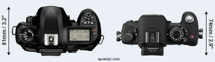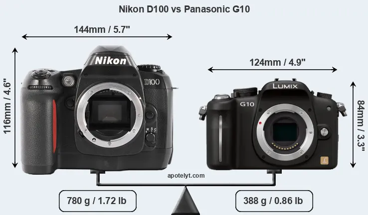 An illustration of the physical size and weight of the Nikon D100 and the Panasonic G10 is provided in the side-by-side display below. The two cameras are presented according to their relative size. Three consecutive perspectives from the front, the top, and the back are available. All size dimensions are rounded to the nearest millimeter.