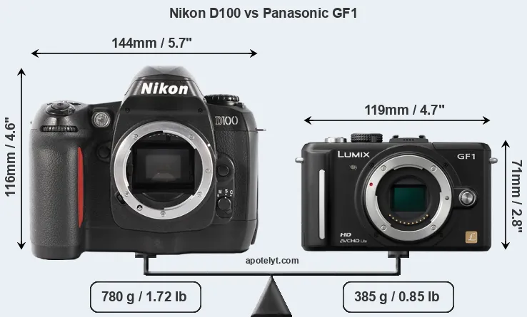 If the front view area (width x height) of the cameras is taken as an aggregate measure of their size, the Panasonic GF1 is considerably smaller (49 percent) than the Nikon D100. Moreover, the GF1 is substantially lighter (51 percent) than the D100. In this context, it is worth noting that neither the D100 nor the GF1 are weather-sealed.