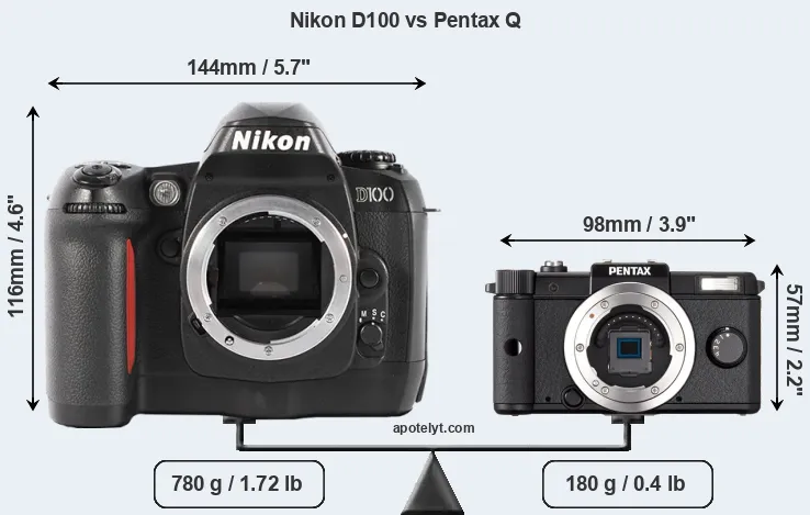 If the front view area (width x height) of the cameras is taken as an aggregate measure of their size, the Pentax Q is considerably smaller (67 percent) than the Nikon D100. Moreover, the Pentax Q is substantially lighter (77 percent) than the D100. In this context, it is worth noting that neither the D100 nor the Pentax Q are weather-sealed.