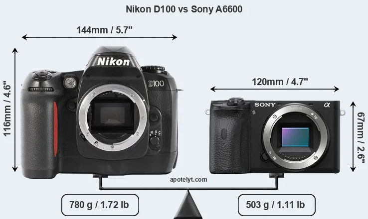 If the front view area (width x height) of the cameras is taken as an aggregate measure of their size, the Sony A6600 is considerably smaller (52 percent) than the Nikon D100. Moreover, the A6600 is substantially lighter (36 percent) than the D100. It is noteworthy in this context that the A6600 is splash and dust-proof, while the D100 does not feature any corresponding weather-sealing.