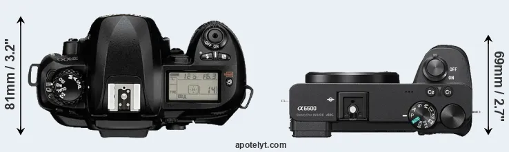 The physical size and weight of the Nikon D100 and the Sony A6600 are illustrated in the side-by-side display below. The two cameras are presented according to their relative size. Three consecutive perspectives from the front, the top, and the back are available. All width, height and depth dimensions are rounded to the nearest millimeter.