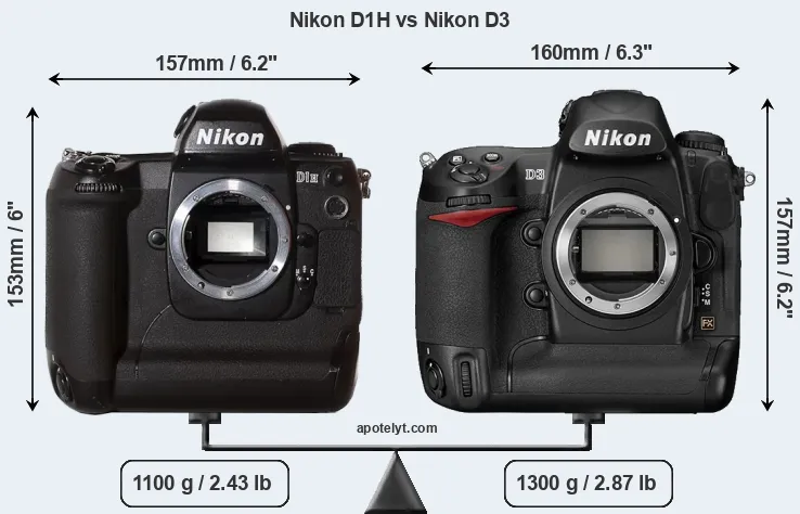 The physical size and weight of the Nikon D1H and the Nikon D3 are illustrated in the side-by-side display below. The two cameras are presented according to their relative size. Three successive views from the front, the top, and the rear are shown. All size dimensions are rounded to the nearest millimeter.