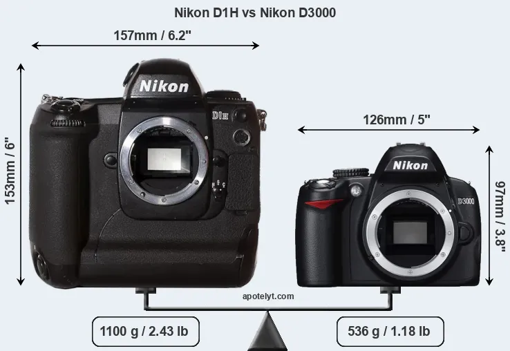 If the front view area (width x height) of the cameras is taken as an aggregate measure of their size, the Nikon D3000 is considerably smaller (49 percent) than the Nikon D1H. Moreover, the D3000 is substantially lighter (51 percent) than the D1H. It is worth mentioning in this context that the D1H is splash and dust resistant, while the D3000 does not feature any corresponding weather-sealing.