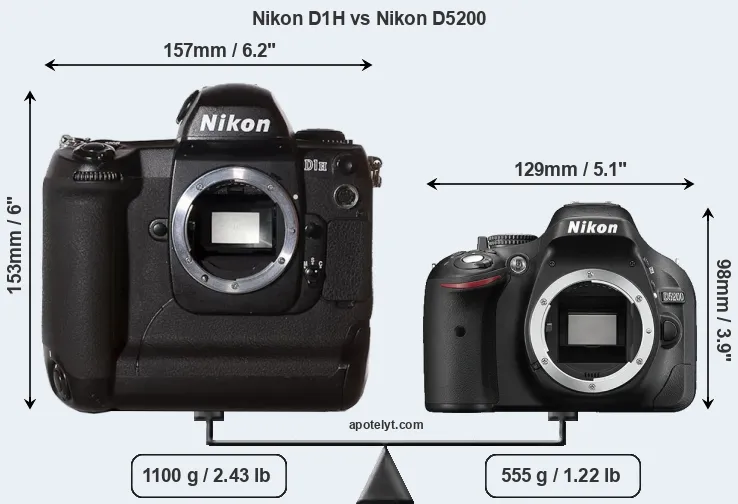 The side-by-side display below illustrates the physical size and weight of the Nikon D1H and the Nikon D5200. The two cameras are presented according to their relative size. Three successive views from the front, the top, and the rear are shown. All width, height and depth dimensions are rounded to the nearest millimeter.