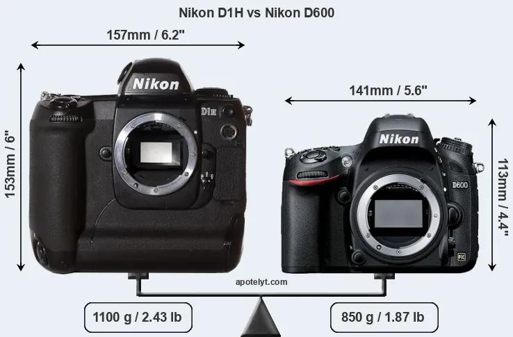 An illustration of the physical size and weight of the Nikon D1H and the Nikon D600 is provided in the side-by-side display below. The two cameras are presented according to their relative size. Three consecutive perspectives from the front, the top, and the back are available. All width, height and depth dimensions are rounded to the nearest millimeter.