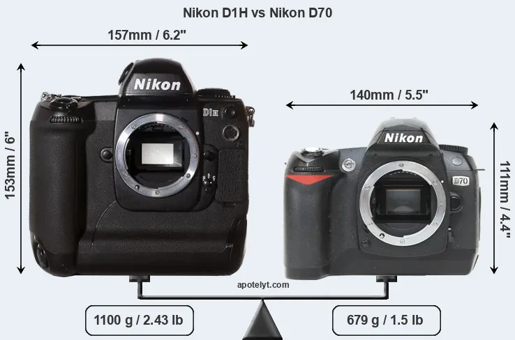 If the front view area (width x height) of the cameras is taken as an aggregate measure of their size, the Nikon D70 is considerably smaller (35 percent) than the Nikon D1H. Moreover, the D70 is substantially lighter (38 percent) than the D1H. It is worth mentioning in this context that the D1H is splash and dust resistant, while the D70 does not feature any corresponding weather-sealing.