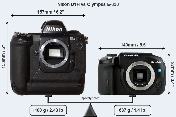 The side-by-side display below illustrates the physical size and weight of the Nikon D1H and the Olympus E-330. The two cameras are presented according to their relative size. Three consecutive perspectives from the front, the top, and the back are available. All width, height and depth dimensions are rounded to the nearest millimeter.