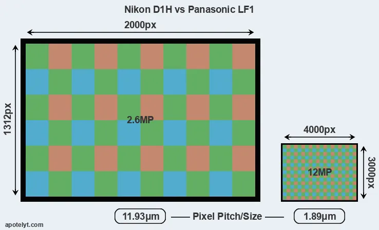 Despite having a smaller sensor, the LF1 offers a higher resolution of 12 megapixels, compared with 2.6 MP of the D1H. This megapixels advantage comes at the cost of a higher pixel density and a smaller size of the individual pixel (with a pixel pitch of 1.89μm versus 11.93μm for the D1H). However, it should be noted that the LF1 is much more recent (by 12 years and 2 months) than the D1H, and its sensor will have benefitted from technological advances during this time that make it possible to gather light more efficiently.