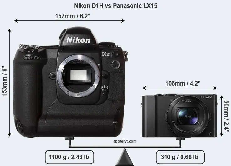 The side-by-side display below illustrates the physical size and weight of the Nikon D1H and the Panasonic LX15. The two cameras are presented according to their relative size. Three consecutive perspectives from the front, the top, and the back are available. All width, height and depth measures are rounded to the nearest millimeter.