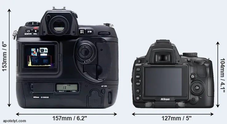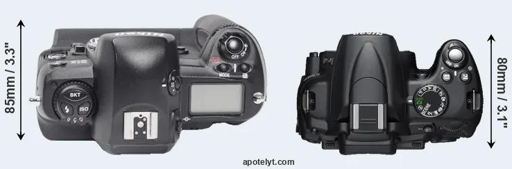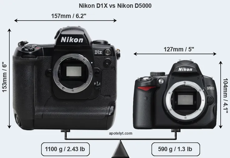 The side-by-side display below illustrates the physical size and weight of the Nikon D1X and the Nikon D5000. The two cameras are presented according to their relative size. Three consecutive perspectives from the front, the top, and the back are available. All width, height and depth measures are rounded to the nearest millimeter.