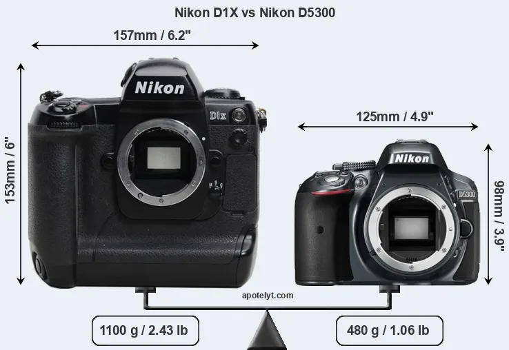 An illustration of the physical size and weight of the Nikon D1X and the Nikon D5300 is provided in the side-by-side display below. The two cameras are presented according to their relative size. Three successive views from the front, the top, and the rear are shown. All size dimensions are rounded to the nearest millimeter.