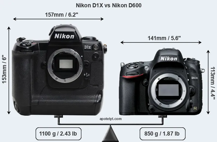 An illustration of the physical size and weight of the Nikon D1X and the Nikon D600 is provided in the side-by-side display below. The two cameras are presented according to their relative size. Three successive views from the front, the top, and the rear are shown. All width, height and depth dimensions are rounded to the nearest millimeter.