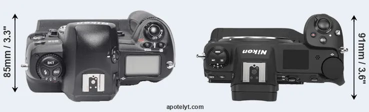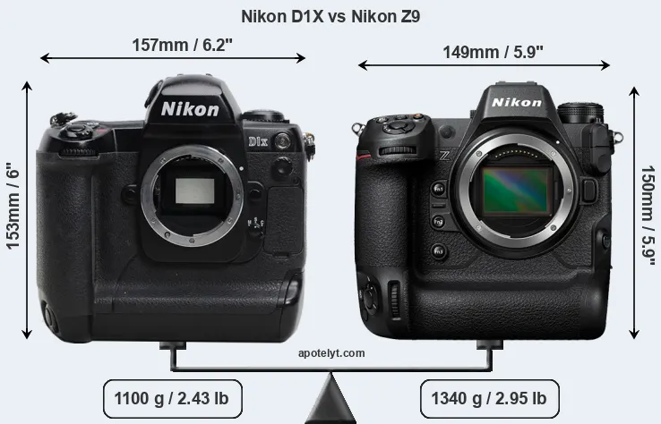 The physical size and weight of the Nikon D1X and the Nikon Z9 are illustrated in the side-by-side display below. The two cameras are presented according to their relative size. Three consecutive views from the front, the top, and the rear side are shown. All size dimensions are rounded to the nearest millimeter.