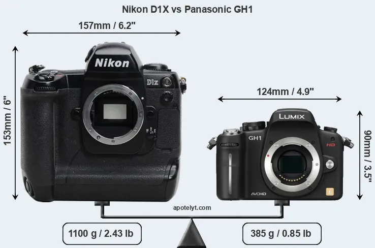 The side-by-side display below illustrates the physical size and weight of the Nikon D1X and the Panasonic GH1. The two cameras are presented according to their relative size. Three consecutive perspectives from the front, the top, and the back are available. All width, height and depth measures are rounded to the nearest millimeter.