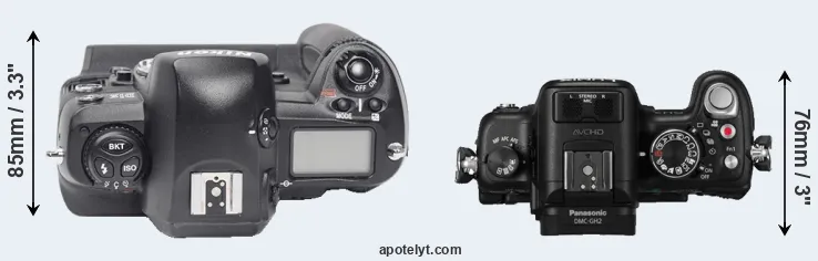 The physical size and weight of the Nikon D1X and the Panasonic GH2 are illustrated in the side-by-side display below. The two cameras are presented according to their relative size. Three consecutive views from the front, the top, and the rear side are shown. All width, height and depth dimensions are rounded to the nearest millimeter.