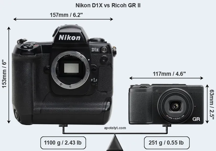 The physical size and weight of the Nikon D1X and the Ricoh GR II are illustrated in the side-by-side display below. The two cameras are presented according to their relative size. Three consecutive perspectives from the front, the top, and the back are available. All width, height and depth dimensions are rounded to the nearest millimeter.