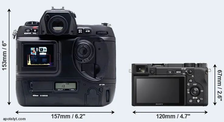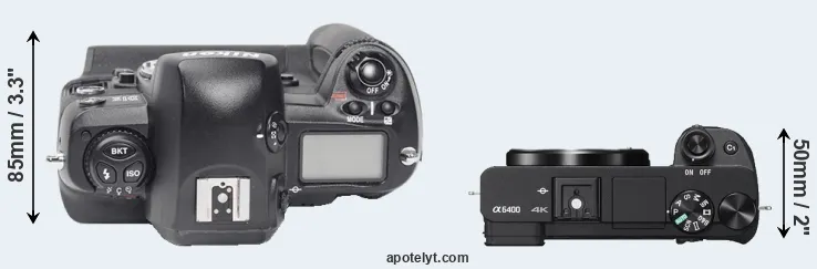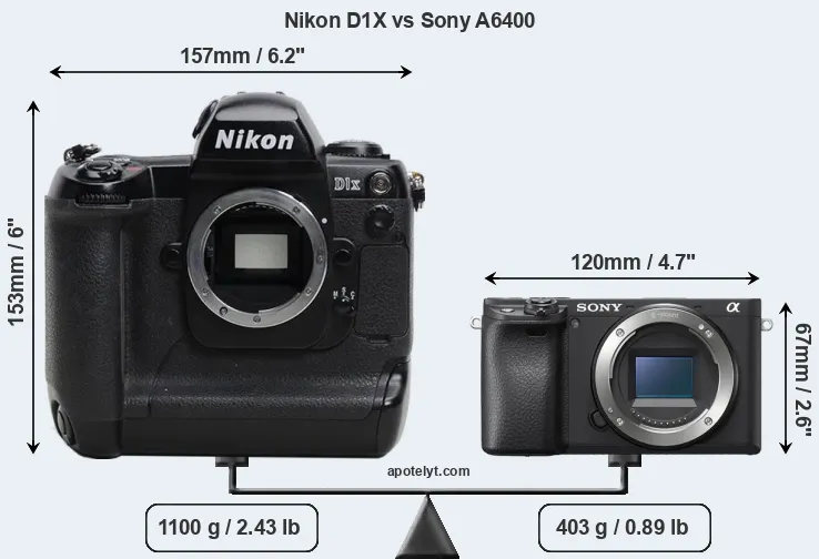 An illustration of the physical size and weight of the Nikon D1X and the Sony A6400 is provided in the side-by-side display below. The two cameras are presented according to their relative size. Three consecutive perspectives from the front, the top, and the back are available. All size dimensions are rounded to the nearest millimeter.