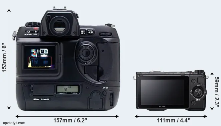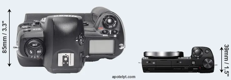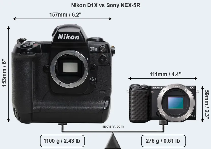 The side-by-side display below illustrates the physical size and weight of the Nikon D1X and the Sony NEX-5R. The two cameras are presented according to their relative size. Three consecutive perspectives from the front, the top, and the back are available. All size dimensions are rounded to the nearest millimeter.