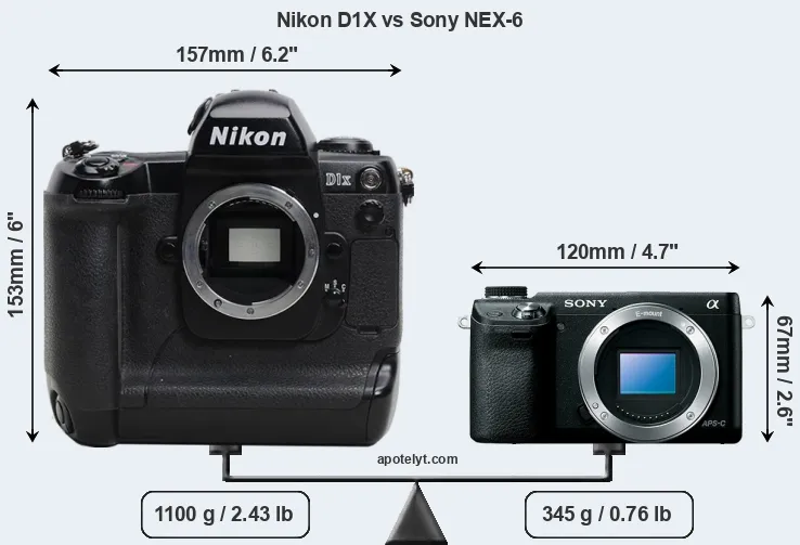 If the front view area (width x height) of the cameras is taken as an aggregate measure of their size, the Sony NEX-6 is considerably smaller (67 percent) than the Nikon D1X. Moreover, the NEX-6 is substantially lighter (69 percent) than the D1X. It is worth mentioning in this context that the D1X is splash and dust resistant, while the NEX-6 does not feature any corresponding weather-sealing.