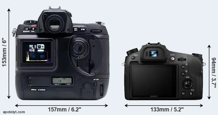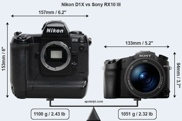 The physical size and weight of the Nikon D1X and the Sony RX10 III are illustrated in the side-by-side display below. The two cameras are presented according to their relative size. Three consecutive views from the front, the top, and the rear side are shown. All width, height and depth dimensions are rounded to the nearest millimeter.