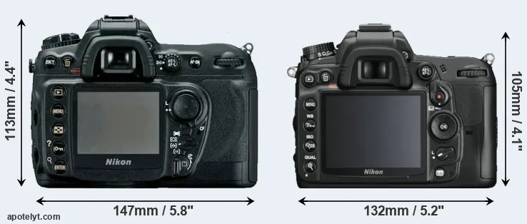 The physical size and weight of the Nikon D200 and the Nikon D7000 are illustrated in the side-by-side display below. The two cameras are presented according to their relative size. Three consecutive perspectives from the front, the top, and the back are available. All width, height and depth dimensions are rounded to the nearest millimeter.