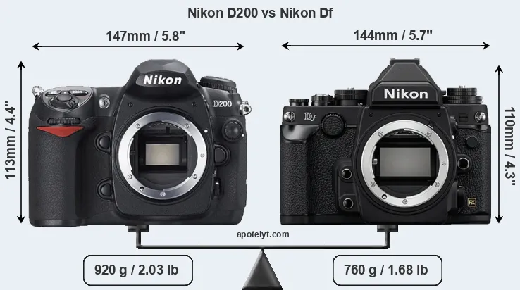 The physical size and weight of the Nikon D200 and the Nikon Df are illustrated in the side-by-side display below. The two cameras are presented according to their relative size. Three consecutive perspectives from the front, the top, and the back are available. All width, height and depth dimensions are rounded to the nearest millimeter.