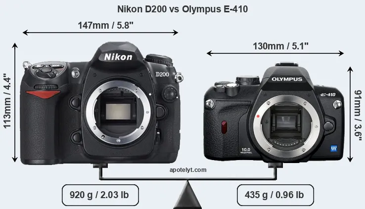 The physical size and weight of the Nikon D200 and the Olympus E-410 are illustrated in the side-by-side display below. The two cameras are presented according to their relative size. Three consecutive perspectives from the front, the top, and the back are available. All width, height and depth measures are rounded to the nearest millimeter.