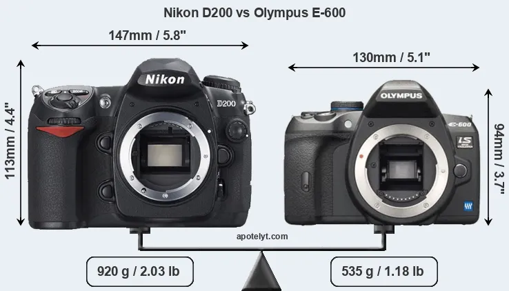 If the front view area (width x height) of the cameras is taken as an aggregate measure of their size, the Olympus E-600 is notably smaller (26 percent) than the Nikon D200. Moreover, the E-600 is substantially lighter (42 percent) than the D200. It is worth mentioning in this context that the D200 is splash and dust resistant, while the E-600 does not feature any corresponding weather-sealing.