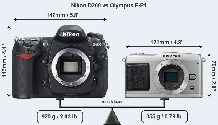 The side-by-side display below illustrates the physical size and weight of the Nikon D200 and the Olympus E-P1. The two cameras are presented according to their relative size. Three successive views from the front, the top, and the rear are shown. All width, height and depth measures are rounded to the nearest millimeter.