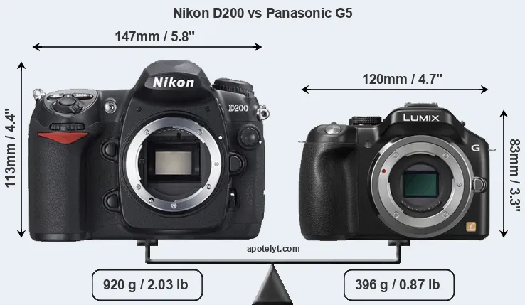 The side-by-side display below illustrates the physical size and weight of the Nikon D200 and the Panasonic G5. The two cameras are presented according to their relative size. Three successive views from the front, the top, and the rear are shown. All width, height and depth measures are rounded to the nearest millimeter.