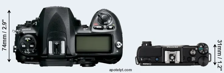 The side-by-side display below illustrates the physical size and weight of the Nikon D200 and the Pentax Q. The two cameras are presented according to their relative size. Three consecutive perspectives from the front, the top, and the back are available. All width, height and depth dimensions are rounded to the nearest millimeter.