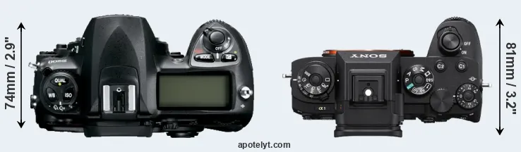 The side-by-side display below illustrates the physical size and weight of the Nikon D200 and the Sony A1. The two cameras are presented according to their relative size. Three consecutive views from the front, the top, and the rear side are shown. All width, height and depth measures are rounded to the nearest millimeter.