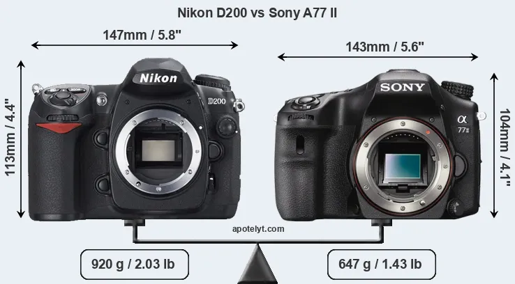 The physical size and weight of the Nikon D200 and the Sony A77 II are illustrated in the side-by-side display below. The two cameras are presented according to their relative size. Three successive views from the front, the top, and the rear are shown. All width, height and depth dimensions are rounded to the nearest millimeter.