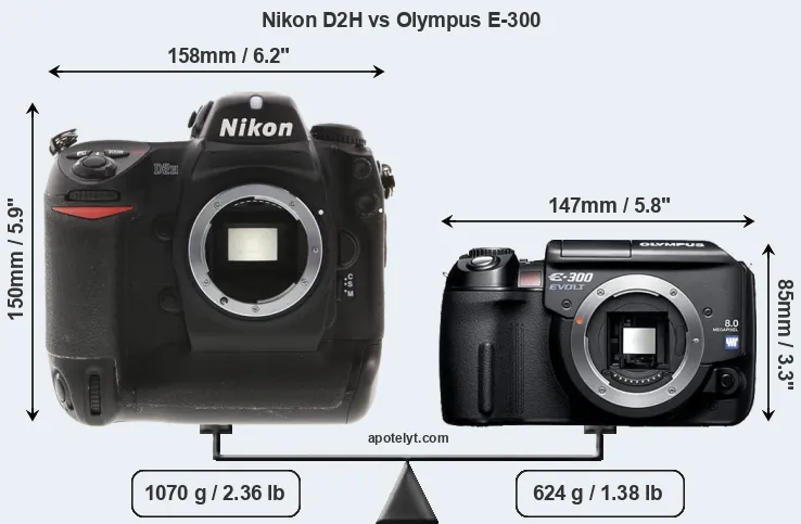 An illustration of the physical size and weight of the Nikon D2H and the Olympus E-300 is provided in the side-by-side display below. The two cameras are presented according to their relative size. Three consecutive perspectives from the front, the top, and the back are available. All size dimensions are rounded to the nearest millimeter.
